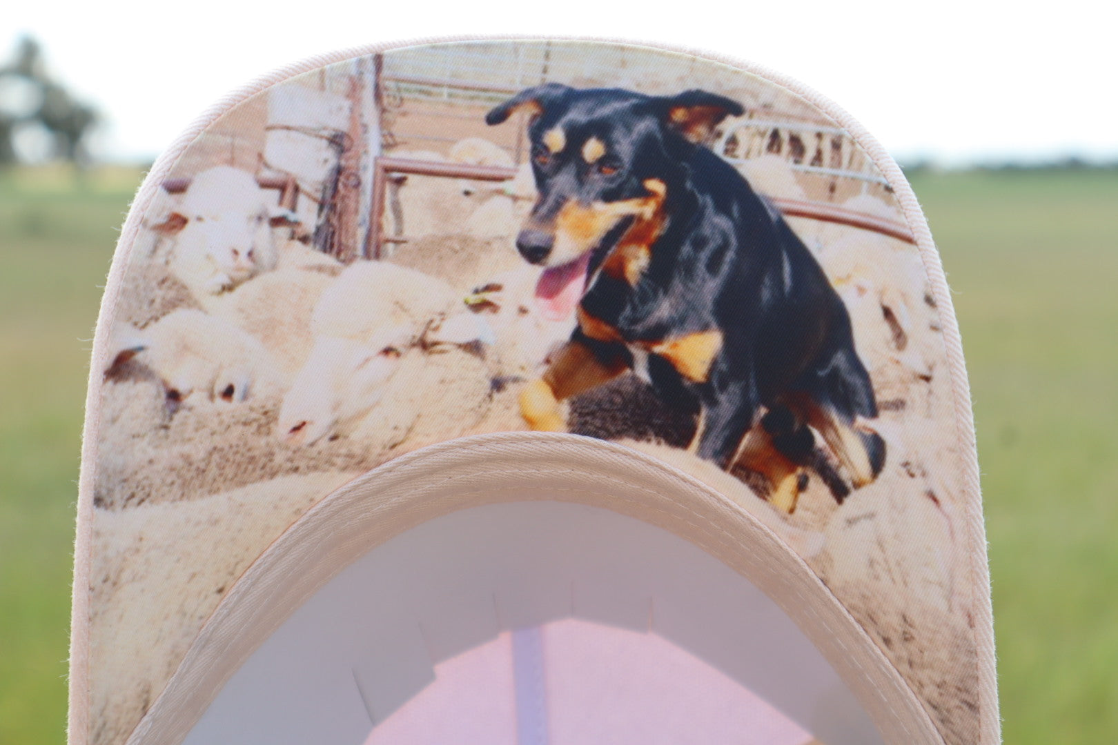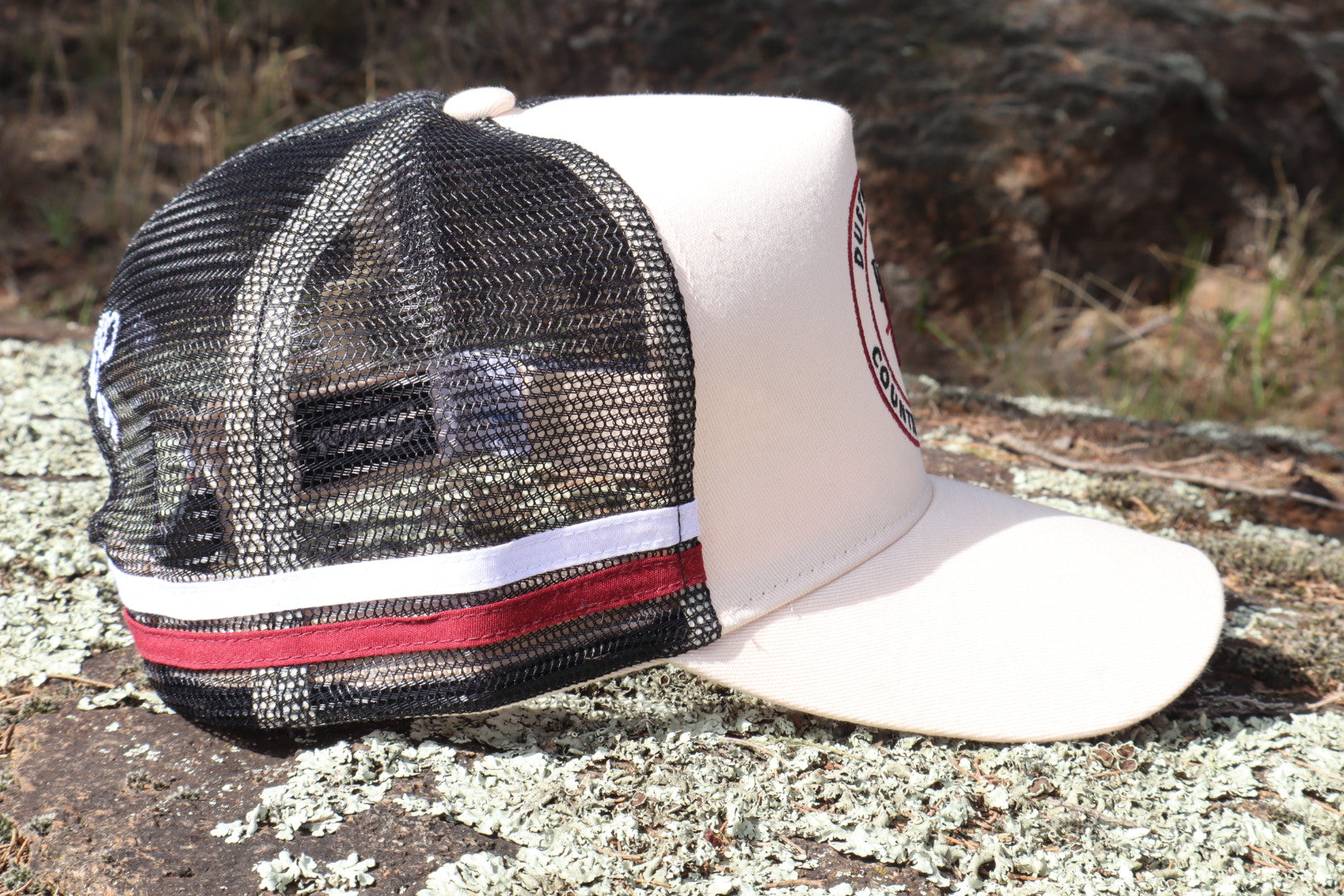 Stone coloured trucker cap with black mesh and maroon highlights.